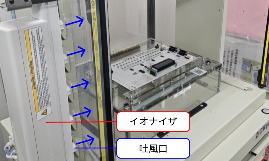 ワークに接触する治具部分について、制電とする事も重要ですが、弊社装置にはイオナイザ(除電器)をオプションとして用意し、装置に内蔵が可能となっています。